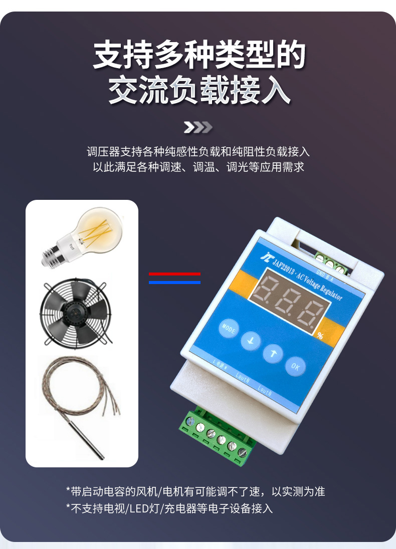 調壓器支持按鍵手動調壓及RS485串口控制調壓,可以應用于交流數字調溫、調功、調速等場合。